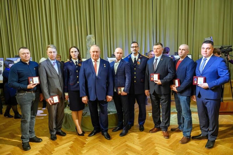 Руководитель управления общественно-политической работы СКР Сергей Петров вручил на открытии юбилейные награды Следственного комитета к 80-летию Победы Руслану Хисамову, руководителю отряда «Совесть», директору Малого театра Тамаре Михайловой, старшему помощнику руководителя СУ СКР по Калининградской области Наталье Гацко, членам поискового отряда и другим сотрудникам театра.