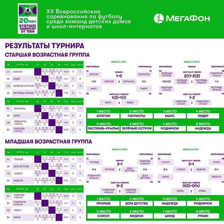 В пятницу в Сочи состоялся финал крупнейшего благотворительного футбольного турнира для детей-сирот «Будущее зависит от тебя». Масштабное спортивное мероприятие поддержала сборная России по футболу, ведущие футбольные клубы страны и волонтерское движение МегаФона, которое в свое время выступило инициатором проекта. Победу отпраздновали команды «Прорыв» из Кировской области (младшая возрастная группа) и «Атлетик» из Тверской области (старшая возрастная группа), а вместе с ней и все участники проекта – ведь в этом году турниру исполняется 20 лет.