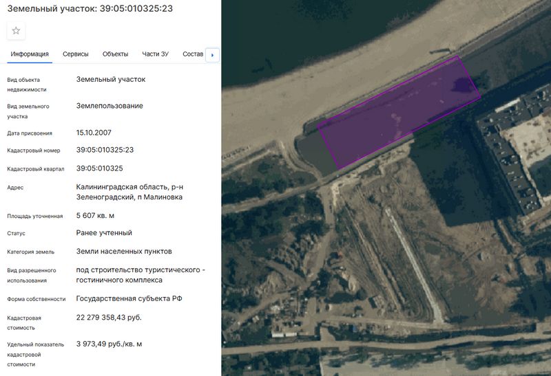 При этом ранее на инвестсовете шла речь о массиве с другим номером 39:05:010325:23, но той же площади 5,6 тыс. кв. м. Сейчас это соседний участок с северо-востока, но тоже на авандюне. Однако его назначение определено «под строительство туристического гостиничного комплекса». На текущий момент какие-либо арендные отношения на него не оформлялись. Вполне вероятно, что у участка появился новый интересант. На этом участке деревья полностью отсутствуют после проведённого в 2021 году такого же масштабного, как и инвестпроект, «благоустройства».