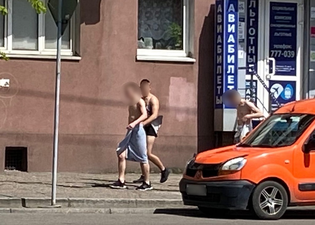 В Калининграде, на площади у Южного воказала, сфотографировали полуобнажённых молодых людей. Снимок выложили в четверг, 7 мая 2020 года, в паблике о калининградских курьёзах*.