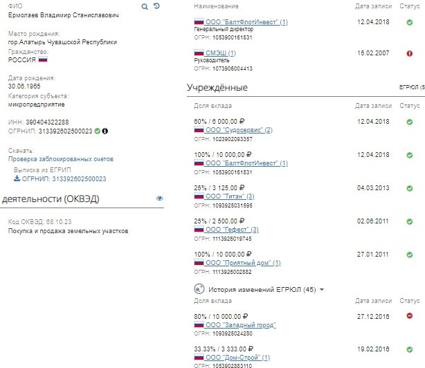 По данным kartoteka.ru, Ермолаев является собственником или входит в состав учредителей нескольких компаний.