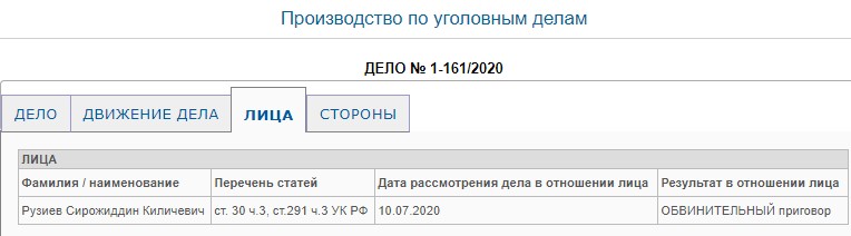 По данным с сайта Гурьевского районного суда, 10 июля 2020 года был вынесен приговор за покушение на взятку в отношении Сирожиддина Киличевича Рузиева.