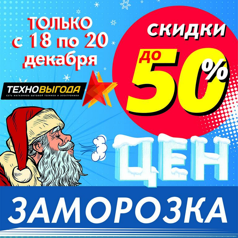 Только 3 дня (с 18 по 20 декабря 2020 года) во всех магазинах сети Техновыгода большая предновогодняя РАСПРОДАЖА! Скидки до 50%!
