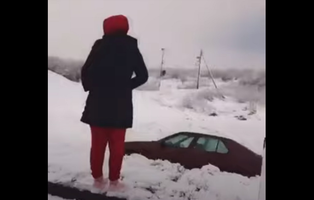 На видео – заснеженная трасса Калининград - Черняховск - Нестеров, красный Renault, съехавший в глубокий кювет и пассажирка. Другая девушка, водитель, снимает на видео и громко комментирует.