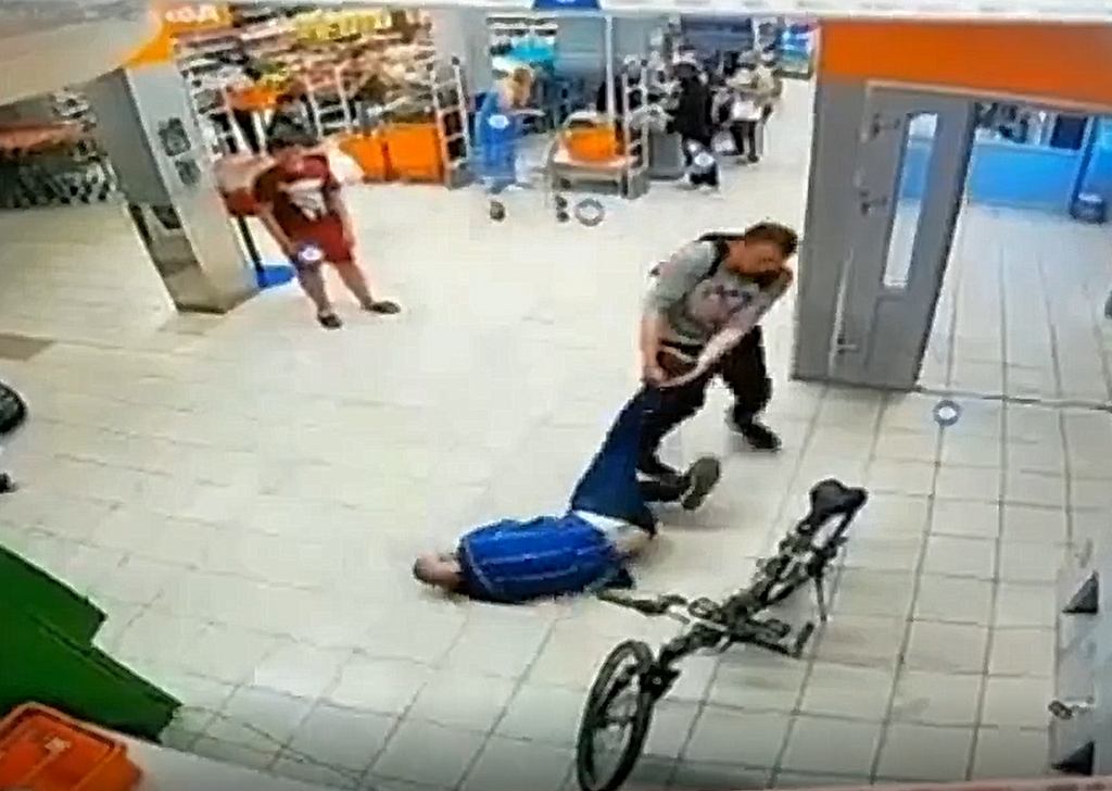 Молодого человека это привело в ярость. Он развернулся и через другую дверь застиг врасплох несущего велосипед уборщика. На видео видно, как он профессионально поставленным ударом кулаком в лицо сбивает с ног человека. Потом он бьёт его ногами в лицо, далее тащит его в торговый зал, после чего берёт снова за ногу и тащит его на улицу. Всё это происходило на глазах сотрудников и многочисленных посетителей магазина.