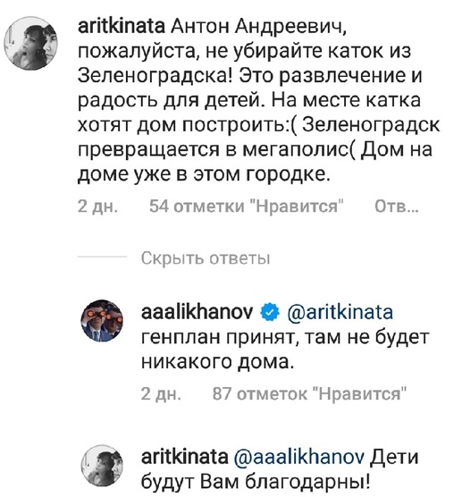 Губернатора попросили не убирать каток, «развлечение и радость для детей». Антон Алиханов, ссылаясь на новый Генплан города, пообещал не допустить там жилищную застройку.