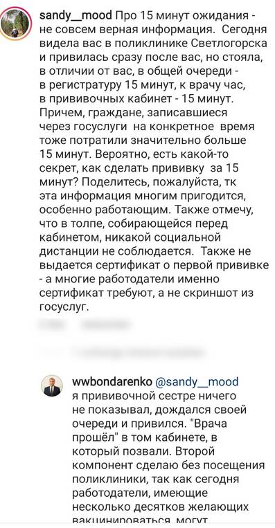 "Про 15 минут ожидания - не совсем верная информация, - написала пользователь sandy__mood. - Сегодня видела вас в поликлинике Светлогорска и привилась сразу после вас, но стояла, в отличии от вас, в общей очереди - в регистратуру 15 минут, к врачу час, в прививочный кабинет - 15 минут. Причем, граждане, записавшиеся через госуслуги на конкретное время, тоже потратили значительно больше 15 минут. Вероятно, есть какой-то секрет, как сделать прививку за 15 минут? Поделитесь, пожалуйста, так как эта информация многим пригодится, особенно работающим. Также отмечу, что в толпе, собирающейся перед кабинетом, никакой социальной дистанции не соблюдается. Также не выдаётся сертификат о первой прививке - а многие работодатели именно сертификат требуют, а не скриншот из госуслуг".