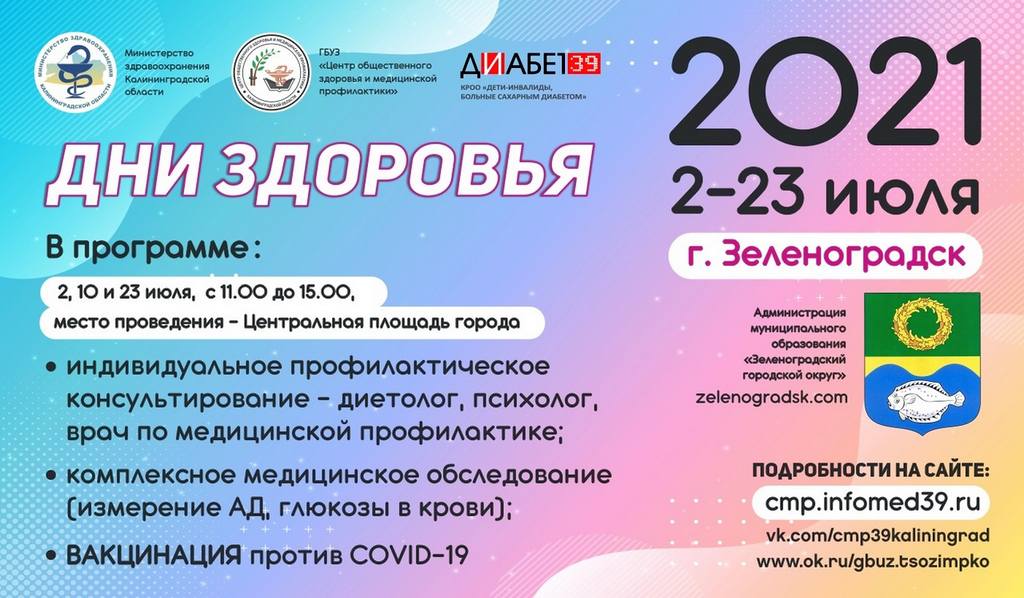 Специалисты ГБУЗ «Центр общественного здоровья и медицинской профилактики Калининградской области" совместно с администрацией Зеленоградского городского округа, при поддержке КРОО "Дети инвалиды, больные сахарным диабетом" проводят "Дни здоровья" в г. Зеленоградске со 2 по 29 июля 2021 года.