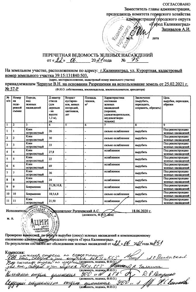 Власти Калининграда готовятся выдать порубочный билет на 9 деревьев и 2 кустарника В. Н. Чернухе.