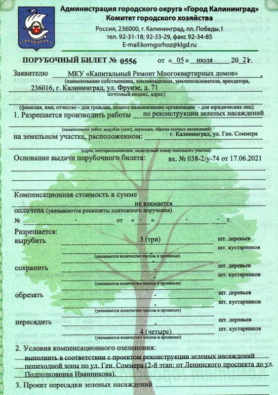 Власти Калининграда дали добро на вырубку трёх деревьев своему же муниципальному казённому учреждению «Капитальный ремонт многоквартирных домов».