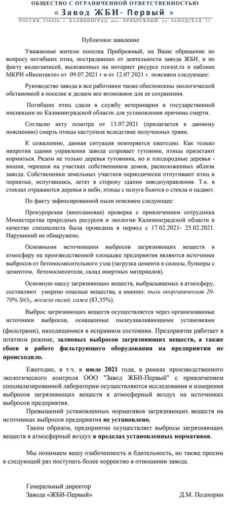 Как сообщили редакции в ЖБИ-1, причина гибели птиц точно неизвестна, гибель не связана с деятельностью предприятия.