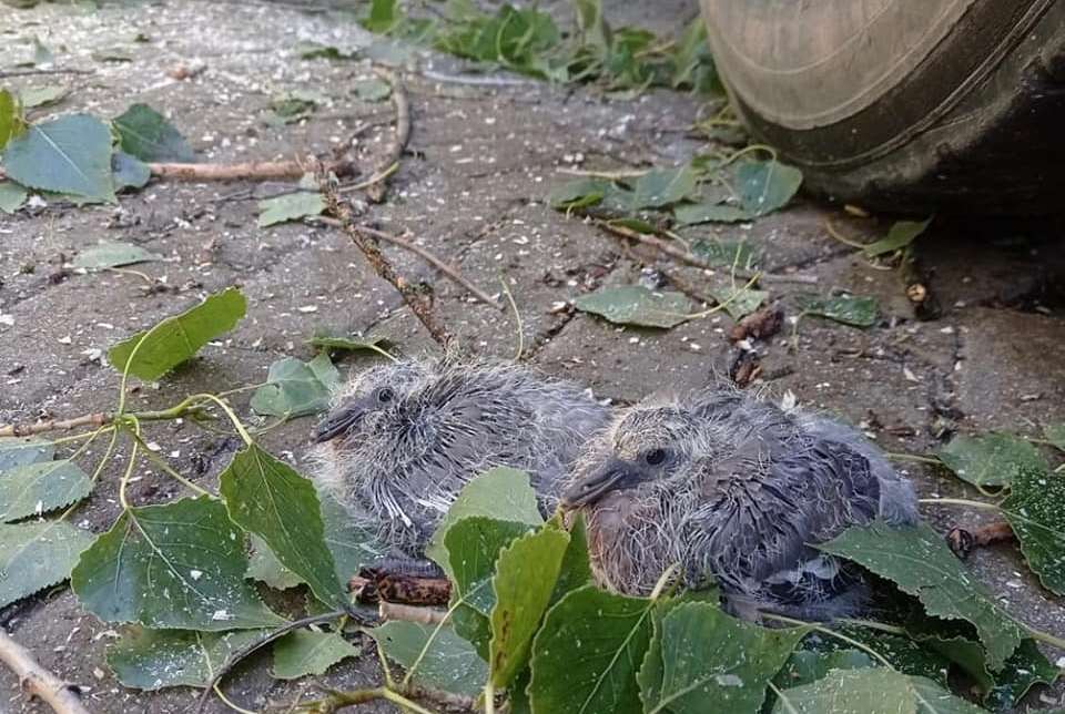 Дерево с гнездом в центре Зеленоградска снесли 10 августа. Птенцы остались без дома и родителей. Очевидец сфотографировал их сидящими под колёсами автокрана вырубщиков. После публикации “Русского Запада” на выручку маленьким птицам пришли эко-активисты.