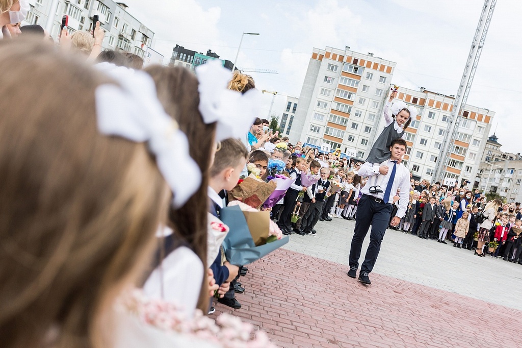 На торжественной линейке собрали всех учащихся. Дети встали плотно друг к другу, без социальной дистанции. Главными гостями мероприятия стали вице-премьер правительства Калининградской области Илья Баринов и глава администрации Калининграда Елена Дятлова.
