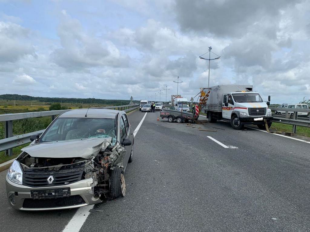 76-летний пенсионер на «Рено» в 10:54 не приметил ведущихся работ по уходу за трассой и наехал на стоявший фургон «ГАЗ» с надписью «Дорожный надзор» с прицепом. Из кузова фургона выпал деревянный брус, попавший в 60-летнего рабочего, ремонтировавшего ограждение.