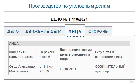 Приговор объявили в пятницу, 8 октября, и пока он не вступил в законную силу. Судя по информации из картотеки суда, обвинение было предъявлено Оводу Александру Михайловичу.