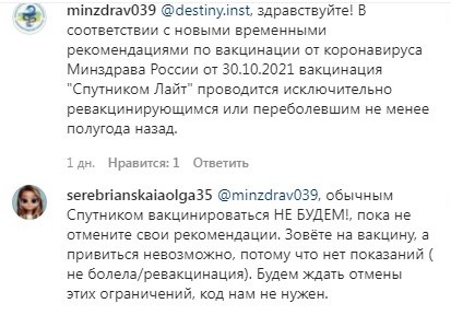 Ране в министерстве здравоохранения пояснили, что согласно рекомендациям Минздрава России от 30.10.2021 «вакцинация «Спутником Лайт» проводится исключительно ревакцинирующимся или переболевшим не менее полугода назад».