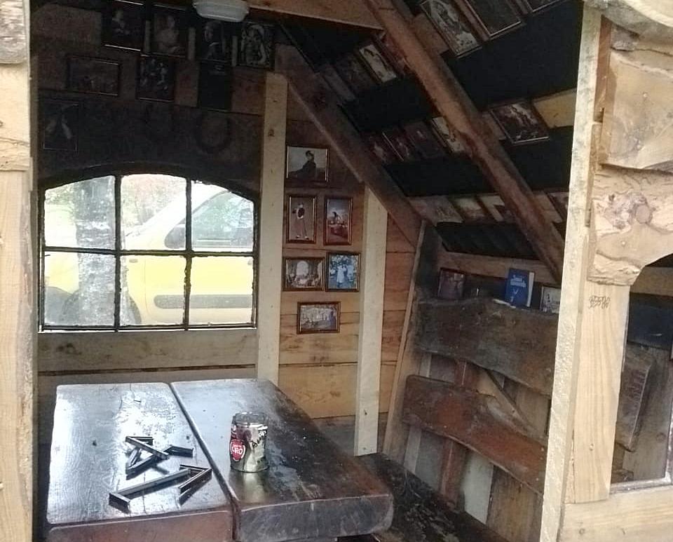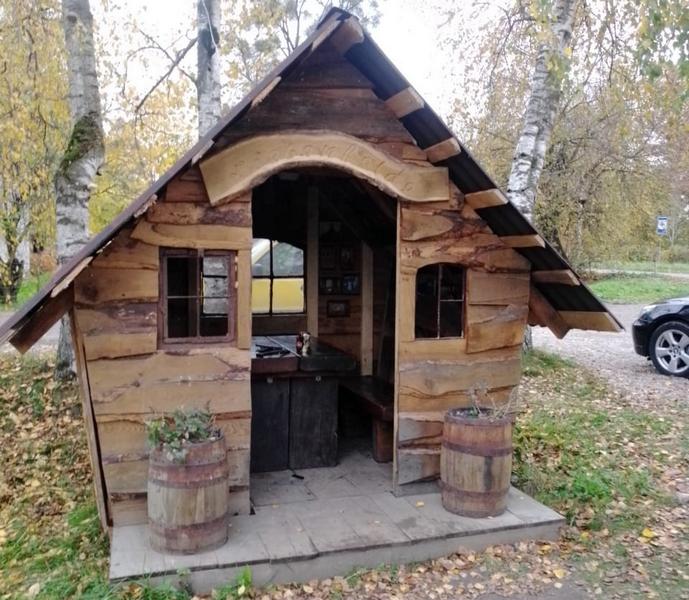 Молодой человек положил глаз на общественное достояние в посёлке Залесье. Местный меценат-владелец магазина построил беседку и развешал в ней масляные картины калининградского художника, фотографии и репродукции, создав место для эстетического отдыха.