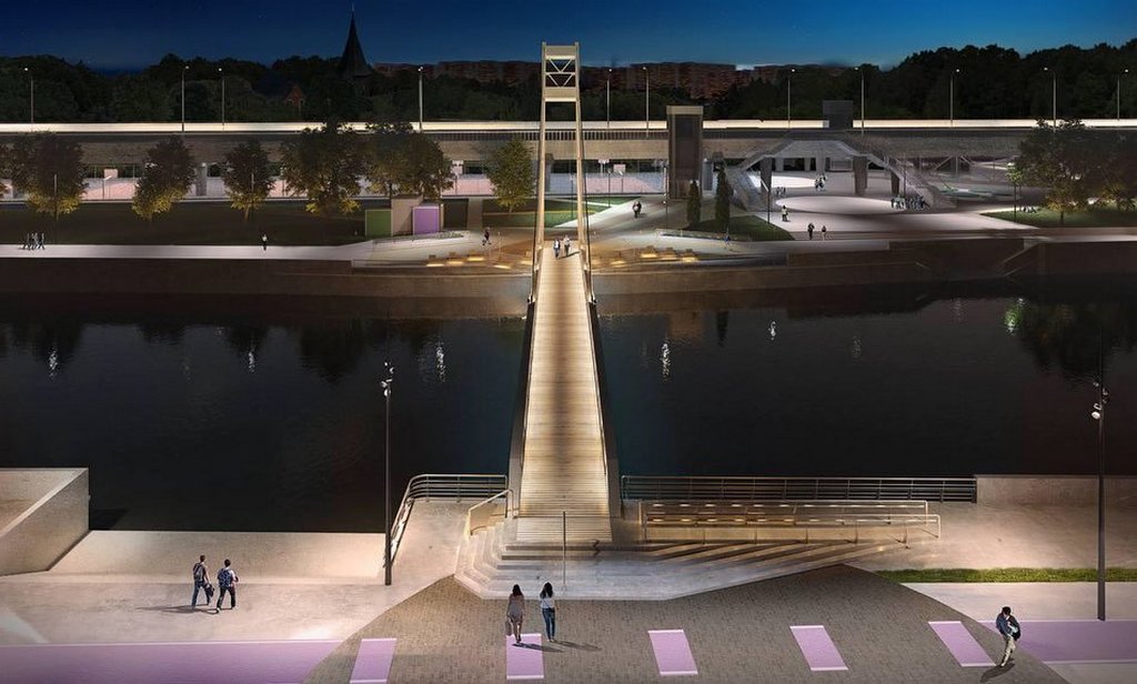 Наиболее амбициозным проектом, представленным сити-менеджером, стал ночной силуэт ещё не построенного пешеходного моста на остров Канта. Контуры надводного перехода от улицы Виктора Гюго в парковую часть центра города планируют обозначить нейтральным и «тёплым» белым. Ванты «моста-рогатки» должны попасть в створы узколучевых прожекторов, а перила проектировщики рассчитывают подсветить изнутри. Контражурную композицию должны дополнить синие блики под мостом – с его нижней части свет должен падать на воду Преголи.