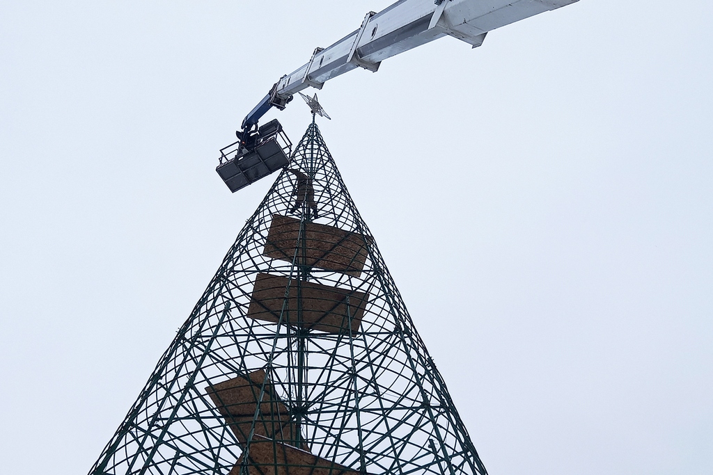 Каркас для новогодней ёлки в Калининграде установили и закрывают пластиковыми «ветками». В этот же день стало известно, что новогодняя ярмарка на острове Канта оказалась под угрозой срыва.