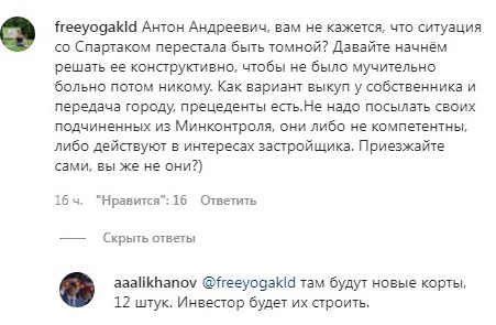 В субботу, 18 декабря 2021 года, Алиханов на вопрос, что происходит на «Спартаке», ответил, что ведётся демонтаж забора, разрешение на это есть. Губернатор также сообщил, что «там не будет (не планировалось) никаких апартаментов». По его словам, инвестор построит 12 теннисных кортов.