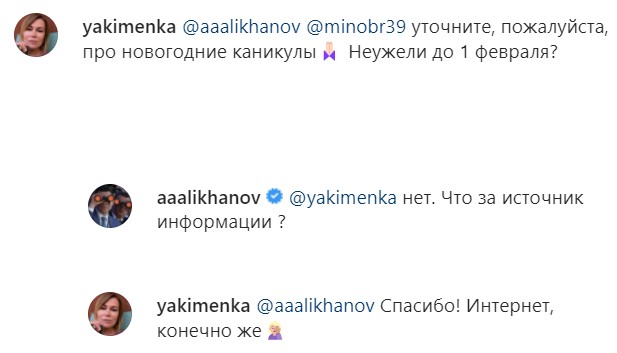 На вопрос в инстаграме («Уточните, пожалуйста, про новогодние каникулы. Неужели до 1 февраля») в субботу, 18 декабря 2021 года, Антон Алиханов ответил лаконично: