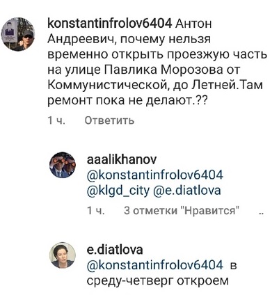 Пользователь инстаграм губернатора Антона Алиханова попросил открыть участок от ул. Коммунистической до ул. Летней, где пока не ведут ремонт.
