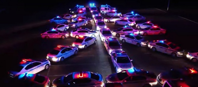 Судя по видео, выстраивать автомобили на площадке у стадиона «Калининград» инспекторы начали днём. А закончили развлекаться, когда уже было темно и стало заметно проблесковые огни. Они выступили в качестве гирлянд на автоёлке.