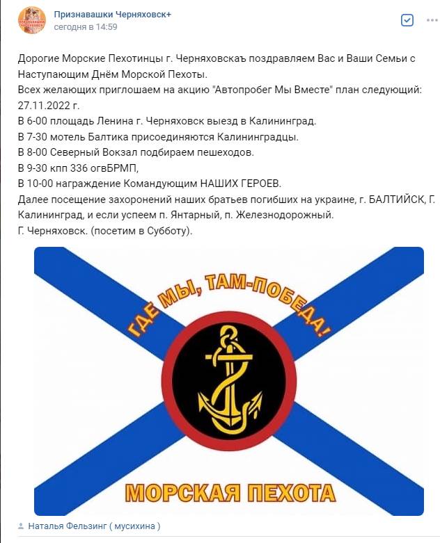 В Калининградской области в воскресенье, 27 ноября 2022 года, запланирован автопробег, посвящённый Дню морской пехоты.