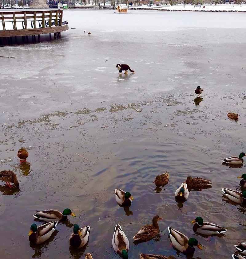 На фотографии пушистый зверёк стоит на тонком льду пруда в парке Плантаже. Кот пристально смотрит на уток, плавающих в сужающейся полынье. Пернатые стараются прижаться к берегу, чтобы увеличить дистанцию между собой и хищником.