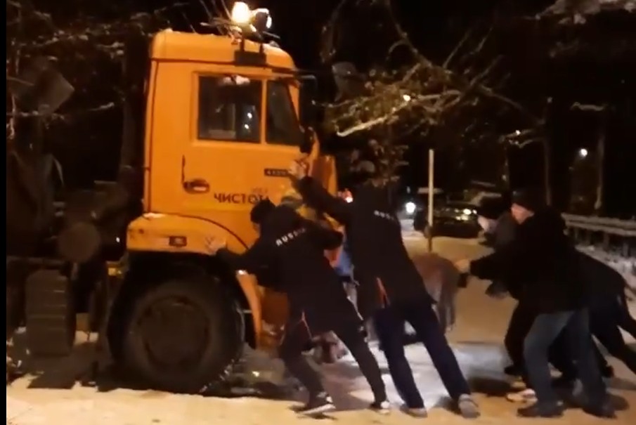 В микрорайоне им. А. Космодемьянского водителю специальной техники крупно повезло. Когда оснащённый оборудованием для разбрасывания песко-соляной смеси грузовик не смог сдвинуться с места, казалось, что стоять придётся до прихода подмоги с базы. Однако, из проезжавшего мимо автобуса вышли спортсмены, то ли ехавшие, то ли возвращавшиеся с тренировки в рядом расположенном физкультурно-оздоровительном комплексе.