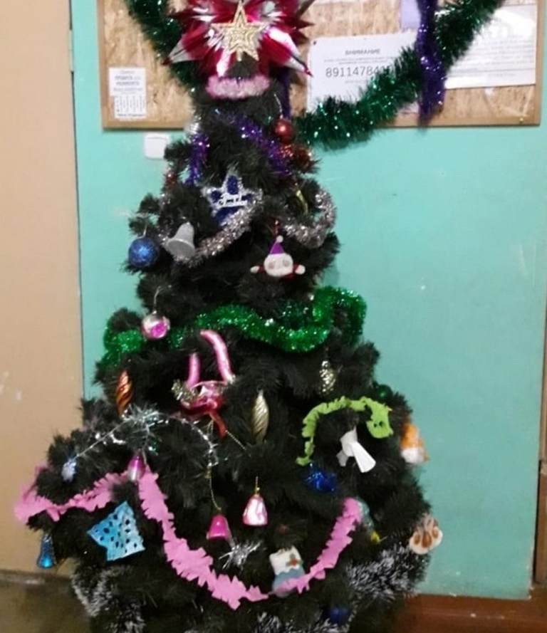 Ёлка была украшена поделками местной детворы. Жильцы вместе готовились к Новому году. Теперь остались только подставка и дождик на стене, обрамляющий часы с застывшими когда-то стрелками.