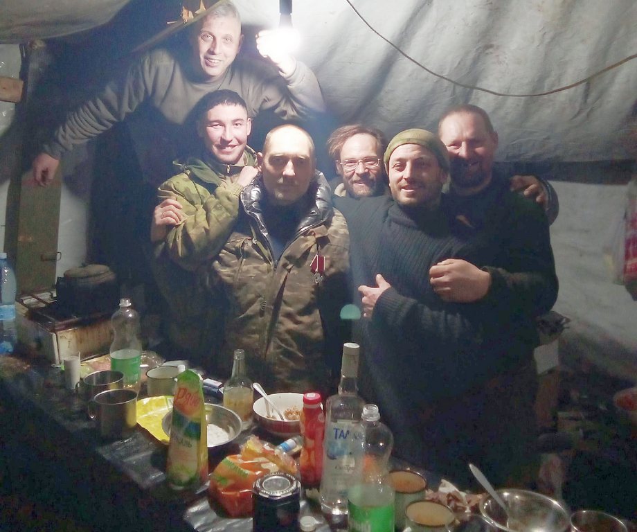 Фотография группы военнослужащих сделана в полевых условиях, вероятно, в палатке. На переднем плане — хорошо накрытый стол, предположительно со спиртными напитками (что в бутылке сказать сложно, на надпись «Талка» говорит о многом).