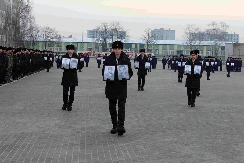 Военнослужащие пронесли по плацу портреты погибших товарищей. К мемориалу были возложены цветы.