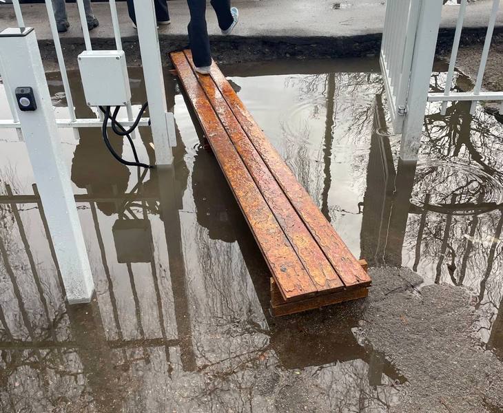 Вход в школу в Долгоруково на днях в буквальном смысле затопило. Чтобы добраться до источника знаний, детям приходится или хорошо прыгать через глубокую и протяжённую лужу (не зря спортзал модернизировали) или ступать по заботливо кем-то опрокинутой лавке. Она хоть и скользкая, но снимает частично риск плюхнуться в воду (хотя некоторые падают). Другого пути в школу нет.