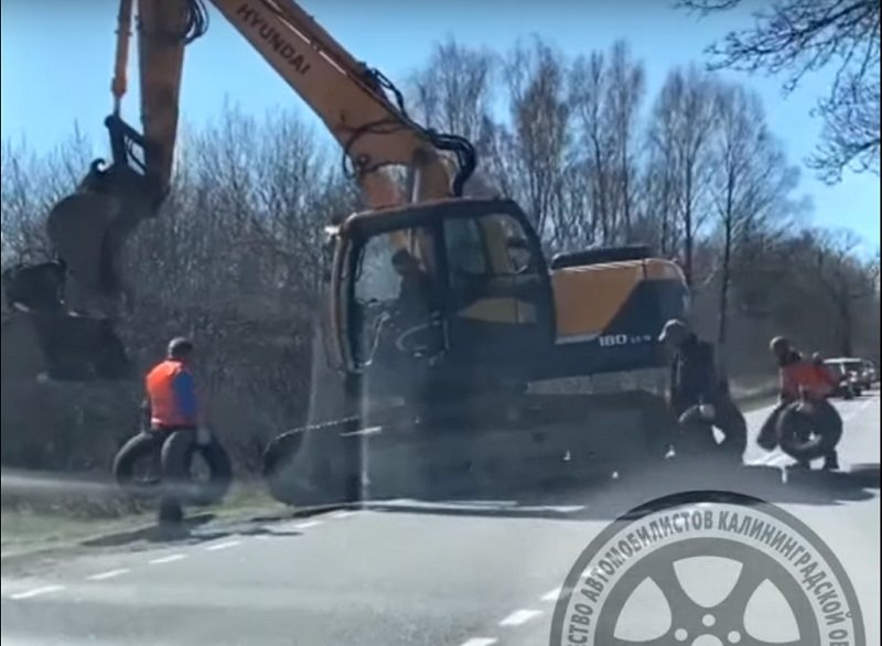 Ехавшие на своих машинах по дороге Калининград - Балтийск вынуждены были остановиться, чтобы пропустить экскаватор, пересекавший проезжую часть. Перед гусеничным исполином и за ним ходили рабочие. Люди подкладывали крупные автомобильные покрышки под траки экскаватора. Звенья ленты сминали резину и тяжёлая спецтехника преодолевала ещё один метр, оставляя асфальт целым. Покрышки, по которым экскаватор проехал, рабочие переносили и подкладывали перед гусеницами. Только после этого махина продолжала движение к обочине.
