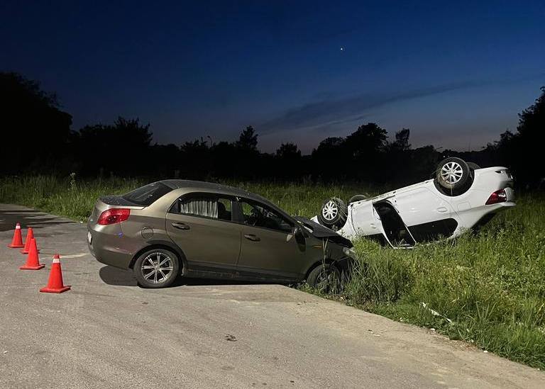 Впрочем, фотография с места происшествия рассказывает больше: скорость «Чери» была настолько большой, что от удара «Рено» подбросило в воздух и перевернуло на крышу.