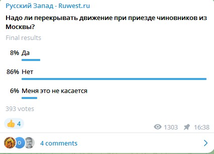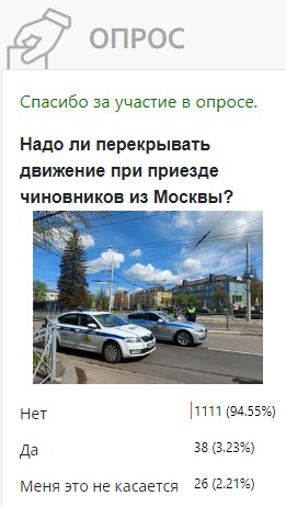 Подавляющее большинство в лице 93% считает, что нельзя перекрывать дороги даже ради приезда высоких чиновников из Москвы. Пусть они выбирают время, когда на дорогах и так меньше машин.