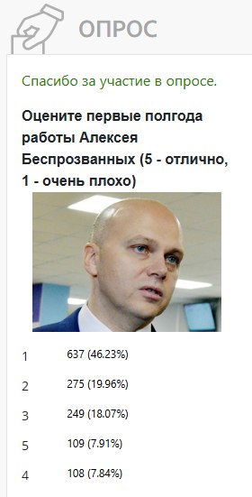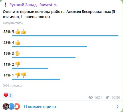 Как и в прошлый раз, оценки существенно отличаются при сравнении опросов на сайте и в телеграм-канале «Русского Запада». В телеграме Алексей Беспрозванных набрал убедительные 33% «пятёрок» и 23% «четвёрок». Большого присутствия ботов в опросе редакция не заметила.