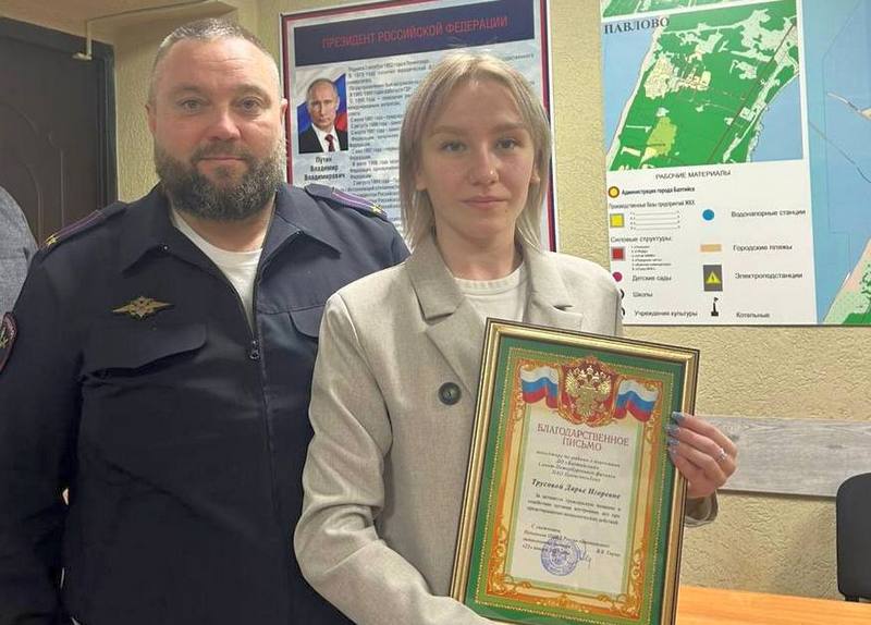 Подполковник полиции Виктор Тюрин лично вручил Дарье Трусовой благодарственное письмо за содействие работе органов внутренних дел.