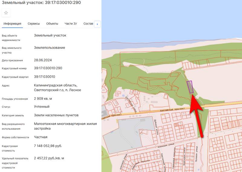 А вот участку Канаева площадью 2 909 квадратных метров (КН 39:17:030010:290), предназначенному под малоэтажную многоквартирную жилую застройку и также находящемуся в частной собственности, повезло меньше. Он идеально расположен для отеля – в 300 метрах от моря.