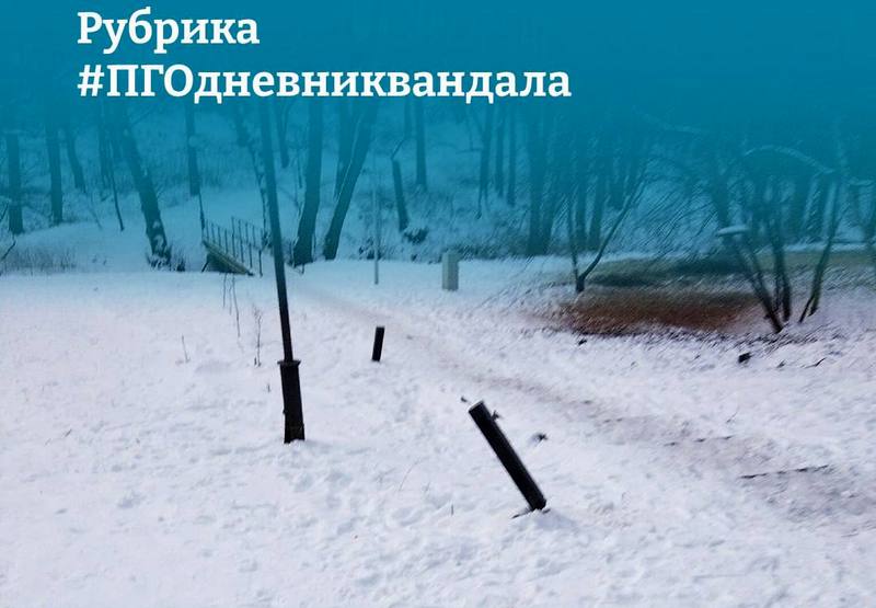 На этот раз «в овраге» хулиганы разрушили совсем новые имиджевые элементы освещения и разбросали их по окрестностям.