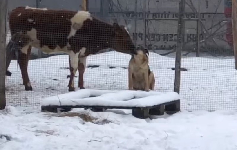 На видео бело-рыжая бурёнка вылизывает с ног до головы пса. Пёс принимает гигиеническую процедуру, видимо, не впервые. Авторы видео – волонтёры центра спасения и передержки животных «Биосфера Балтики», а герои ролика – обитатели этой базы. Как следует из рассказа сами экоактивистов, сцена нежности вызвана особой ролью собаки.