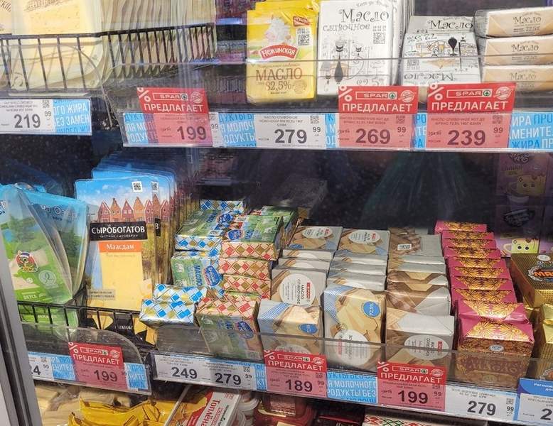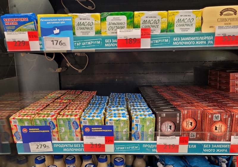 «Русский Запад» сообщал, что губернатор Алексей Беспрозванных подписал соглашения с торговыми сетями и производителями о лимитах на ценовые надбавки. В список из 26 товаров входит и сливочное масло. Контролируемые властями товары обозначены синими ценниками.
