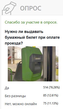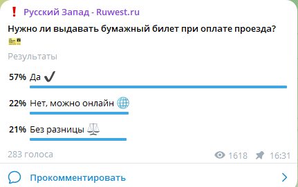 Как показывает опрос «Русского Запада», очень существенное большинство, а именно 71% хотят получить в качестве подтверждения оплаты проезда именно бумажный билет.