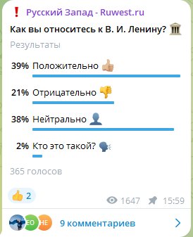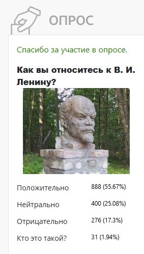 Более того, немного жидкое большинство, а именно, 53% респондентов оценивают его положительно как историческую фигуру. Ещё 18% также помнят о В. И. Ленине, но относятся к нему однозначно отрицательно.