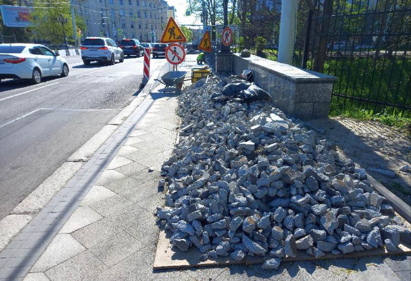 Шедшим в сторону Ленинского проспекта пришлось возвращаться к пешеходному переходу перекрёстка с переулком Дмитрия Донского. Другая сторона «Театрального путепровода» оставалась свободной от ремонта, но тротуар вдоль здания бывшего «Янтарьэнерго» (ныне – «Россети-Янтарь») тоже перекрыли.