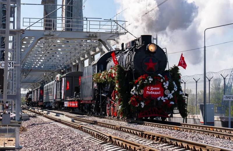 На перроне раритетный поезд встречали местные жители. Они издалека заметили белый пар, и украшенный по-фронтовому локомотив с трубой. Паровоз тянул пассажирские вагоны и платформы, с закреплёнными на них артиллерийскими орудиями.