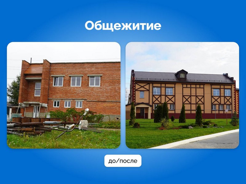 Непригодные для жилья комнаты, судя по фото из губернаторского телеграм-канала, теперь выглядят уютно, чисто и даже симпатично. Новое там всё, от кроватей, до белья. Есть даже маленькая пальма. Фасад общежития перелицевали в немецком духе, под фахверк.