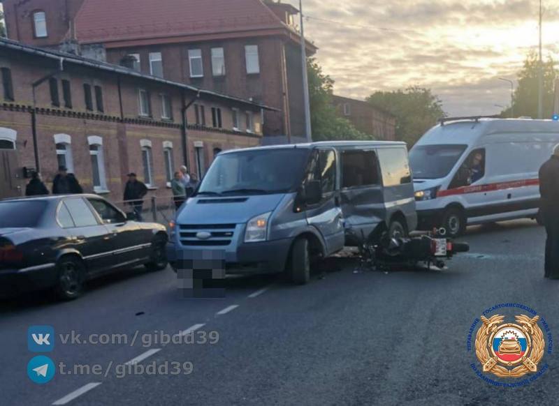 В Черняховске Калининградской области у вокзала водитель микроавтобуса сбил мотоциклиста. ДТП произошло вечером 8 мая 2025 года.