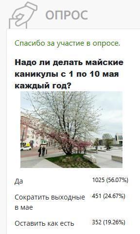 Впрочем, каждый четвёртый (25%) респондент считает, что надо работать больше, и, наоборот, сократить майские праздники с дополнительными днями отдыха.